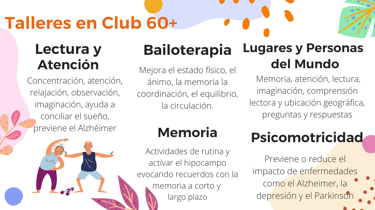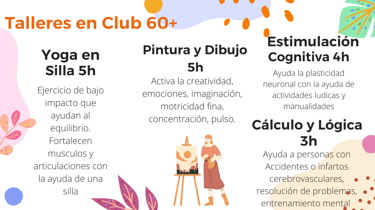 En estos talleres puedes ejercitar la memoria, atención, concentración, agilidad mental, calculo matemático, razonamiento, solución de problemas, lectura comprensiva, vocabulario, pintura, dibujo, motricidad fina y gruesa, praxias, ejercicio físico de bajo impacto, fortalecimiento muscular, gimnasia en silla y mas.